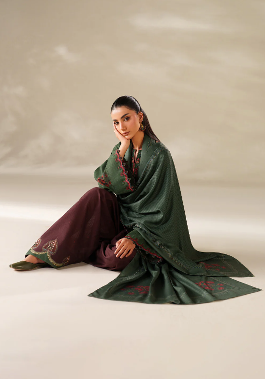 Experience timeless elegance with our Embroidered Khaddar 3-Piece Suit, crafted from premium winter fabric for warmth and comfort. Featuring exquisite embroidery on the shirt, a soft khaddar trouser, and a beautifully printed dupatta, this ensemble blends tradition with modern charm — perfect for graceful, effortless style this season.